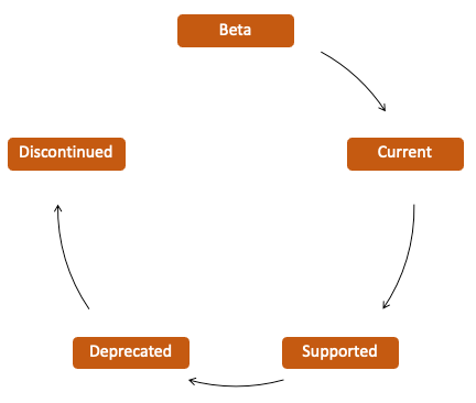 Every 6 months, we test and finalize the Beta version and then move all existing API versions along to the next lifecycle stage. Beta moves to Current, Current to Supported, and so on. When an API reaches Discontinued, it is removed from production and no longer available.