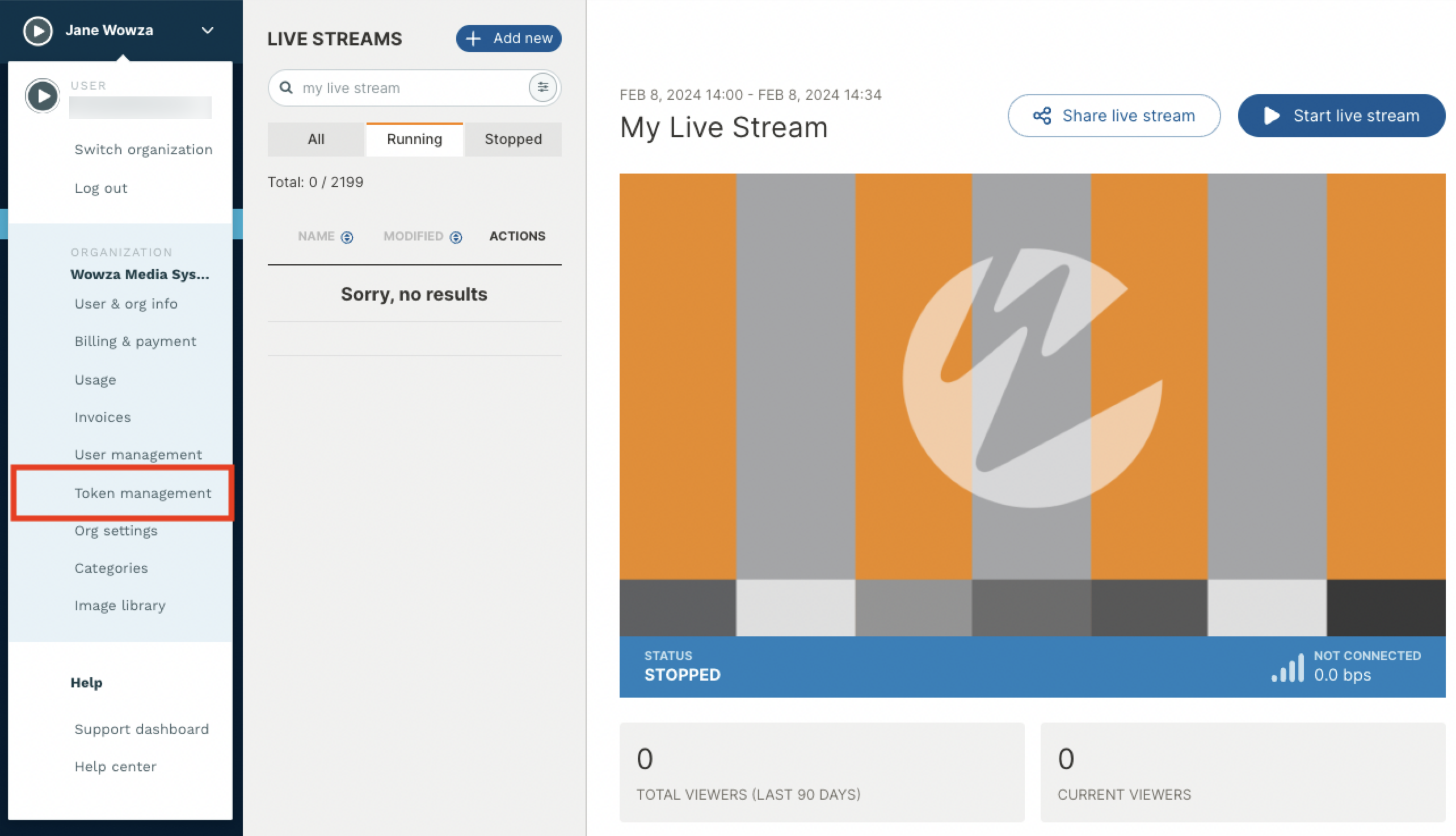 - Personal access token — Available to all users with a Wowza Video license. These tokens are specific to a user and can be used in API calls to do quick tests or manual actions that don't need to persist if the user leaves the organization.