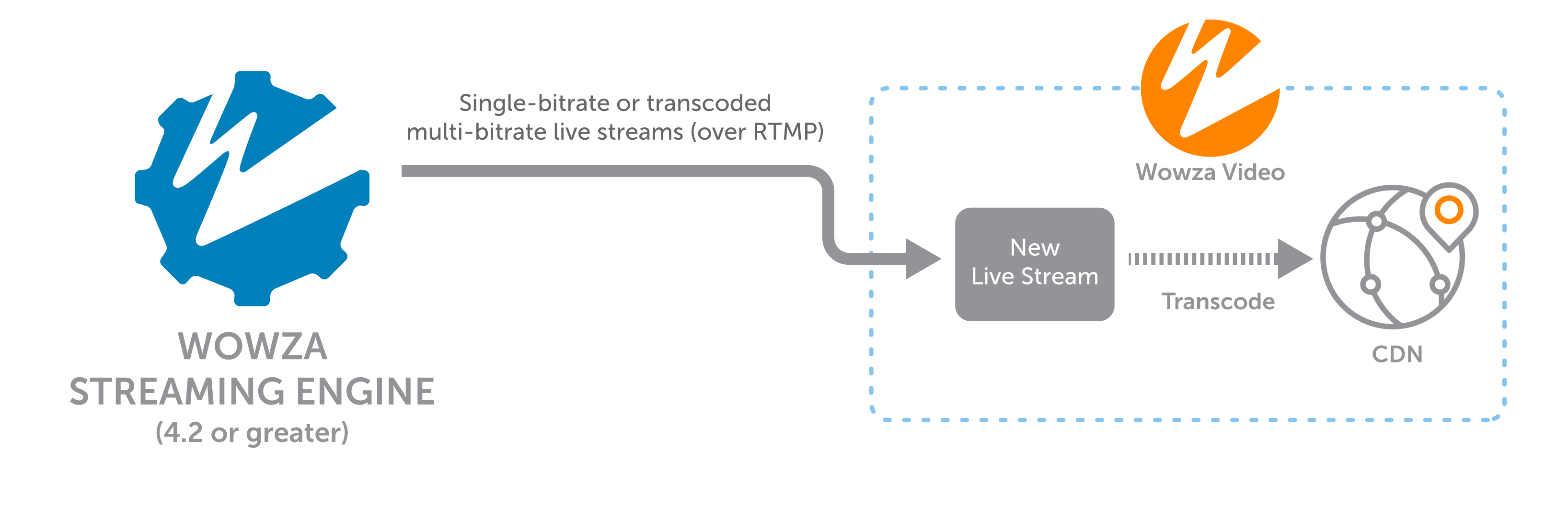 With Wowza Streaming Engine™ media server software version 4.2 and later and the Wowza Video™ service, you can send single bitrate streams from Wowza Streaming Engine to Wowza Video Legacy for adaptive bitrate transcoding and delivery to viewers over the Wowza CDN edge network. This workflow allows you to use Wowza Video's high-performance servers and high-bandwidth networks for the heavy lifting of transcoding before delivering the stream to viewers.